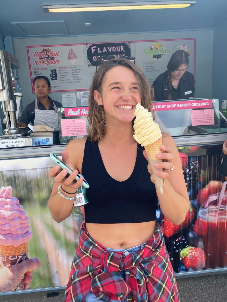 Molly with some real fruit ice cream on the way down to the beach
