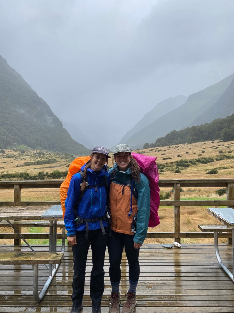 We bid our time reading books and playing card games, eating our dehydrated dinners and then heading off to bed early, exhausted from the big day. The next morning, it was pouring rain, but the sound of the water on the roof of the hut was so soothing. We again had a slow time getting up and tried to wait out the rain stopping. When it didn’t look promising, we donned rain jackets and put covers over our backpacks and began the two hour hike out to the mouth of the river where the jetboat would pick us up to take us back to civilization in Makarora.